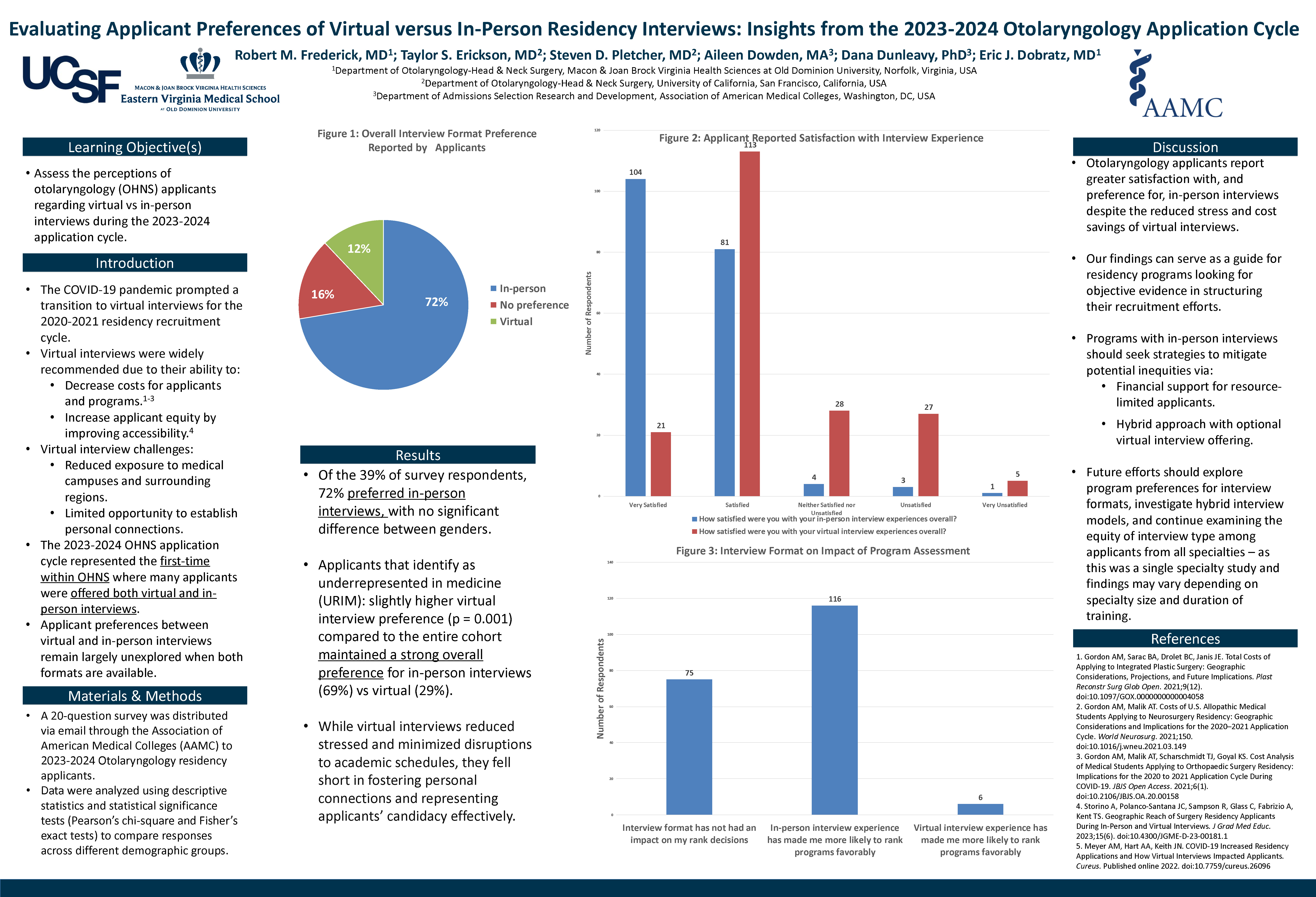 Frederick: Overall, applicants to otolaryngology - head and neck surgery programs show greater satisfaction with, and preference for, in-person interviews despite the reduced stress and cost savings associated with virtual interviews. With this information, programs can tailor their recruitment and interview season to align with these applicant preferences as much as possible. It’s also important to note that virtual interviews still play a role for making interview season fair for all applicants with attention to those from lower socioeconomic statuses. Future research should investigate methods of introducing the optimal mix of in-person and virtual interviews while being cognizant and controlling for any potential biases associated with the different interview formats.